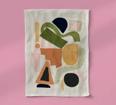 A modern and playful abstract composition featuring a gridlike arrangement of colorful, organic shapes. The artwork feels like a sophisticated and balanced puzzle of form and color.