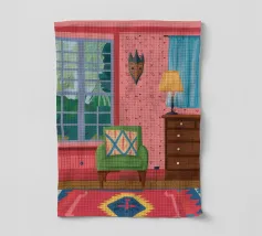 A vibrant, maximalist reading nook bursting with color and pattern. A comfy sofa is surrounded by a gallery wall of art, a checkered lamp, and lush plants, creating a joyful and inspiring creative space.