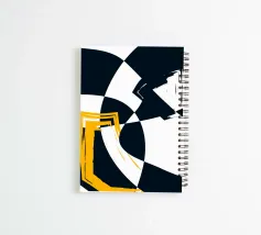 Abstract shapes in black, white, and gold create a dynamic composition with flowing curves and sharp angles. The interplay of colors adds depth and movement, suggesting a sense of energy and contrast.