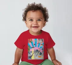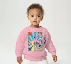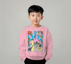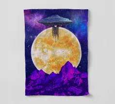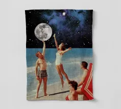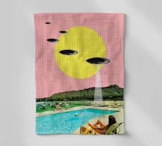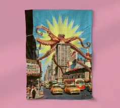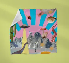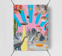 The colorful madness and chaos of collage. Every random thing in one image, with some retro graphic design touch. Dinosaur, aliens, octopus, mushroom, blowfish, fried egg, mountains, streetlamp, moon, cinema ticket, etc.