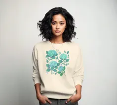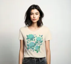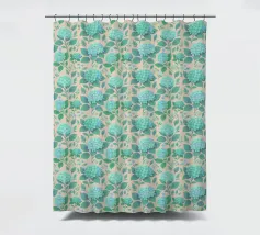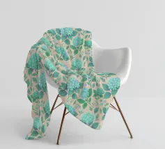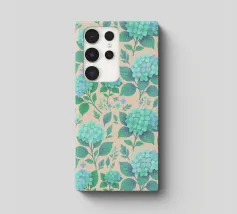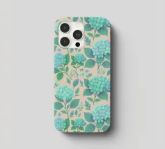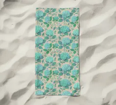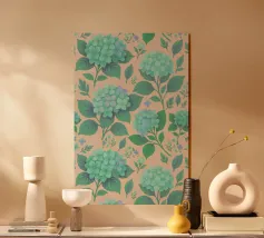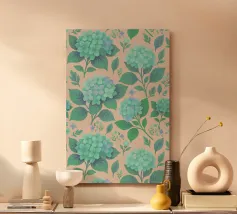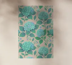 Beautiful hydrangea floral pattern with lush sage green hydrangea flowers with green leaves, on a blush peach background.