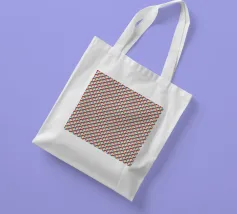 A complex pattern of interlocking shapes in red, teal, and white creates a grid-like optical illusion. The repetitive geometric design adds a sense of movement and depth.