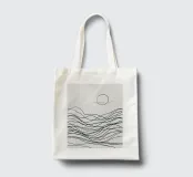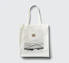 Curved black lines create an abstract landscape against a light background, with a simple circle suggesting a sun or moon above. The composition evokes a sense of calm and simplicity with its minimalist design