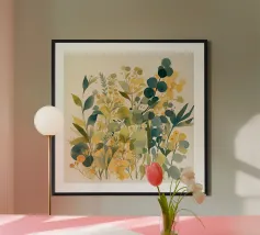 Delicate sprigs and early blooms stand tall in this fresh composition, celebrating the organized chaos of nature’s seasonal rise. A gentle palette of soft greens, pale yellows, and whispering pinks invites a feeling of lightness and openness.