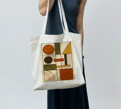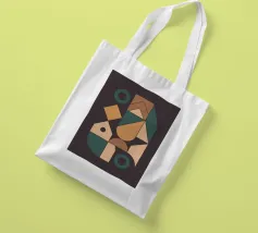 An abstract artwork of geometric shapes in earthy green, orange, and beige tones, arranged with balance on a textured light background.