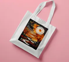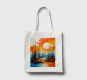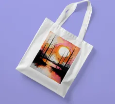 A vibrant and abstract painting capturing the essence of a serene sunset. Bold strokes of orange and blue create a dynamic contrast, while the silhouetted trees and a large, luminous moon add depth and mystery to the scene. This piece is perfect for contemporary spaces seeking a touch of nature and tranquility.