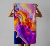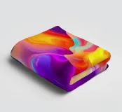 Vivid abstract art displays dynamic swirls and flowing patterns in a mesmerizing blend of bright colors including blue, purple, orange, and pink. The artwork captures a sense of movement and energy.