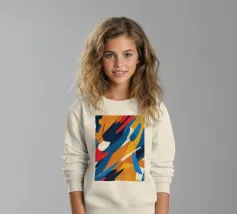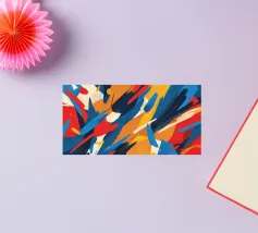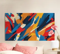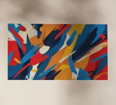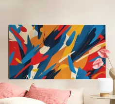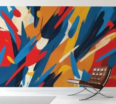 This artwork features a lively composition of bold colors including red, blue, yellow, and orange, creating a dynamic and energetic atmosphere ideal for digital wallpapers and designs.
