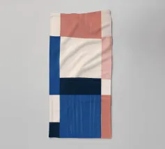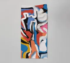 Bold blocks of red and blue are divided by vertical black and white strokes, showcasing a minimalist abstract style. The thick application of the paint and the stark contrast between the colors give the piece a dynamic and expressive feel.