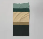 A minimalist design featuring horizontal bands of varying colors. The composition includes shades of teal, beige, brown, and black.