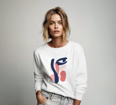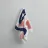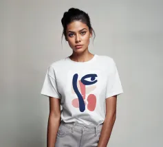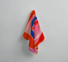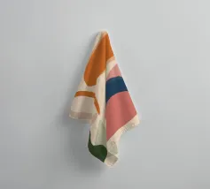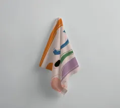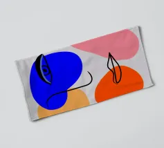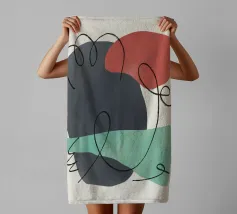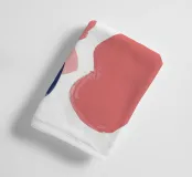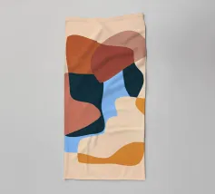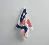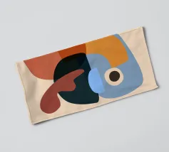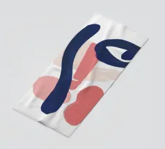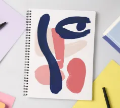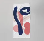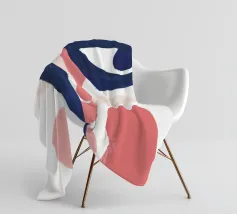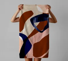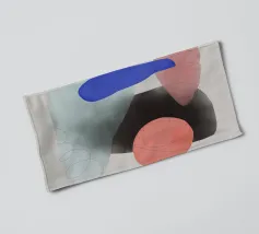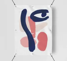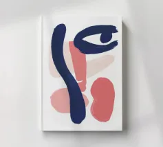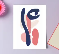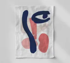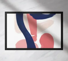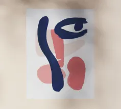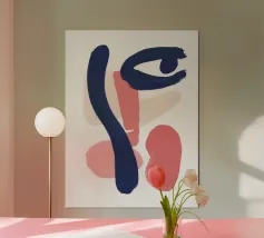 A minimalist abstract composition featuring bold, flowing shapes in dark blue, pink, and terracotta against a light background. The forms seem to interact, creating a visual dialogue.