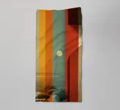 This work is a brilliant exploration of time and perception: the artist overlays a melancholic, photorealistic coastal landscape with vertical, retro-inspired colour stripes. This graphic art style combines mid-century designs with surrealist elements - the stripes in orange, olive and muted red appear like a transparent veil separating reality and memory. The moon or sun shines through the coloured band, adding a spiritual dimension. On the wall, it creates a meditative mood and awakens fading memories.