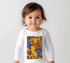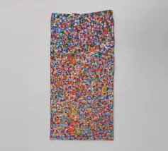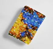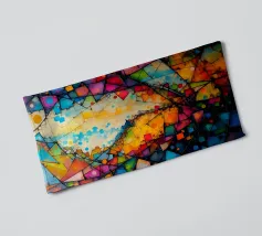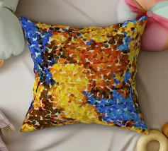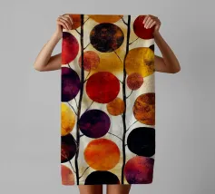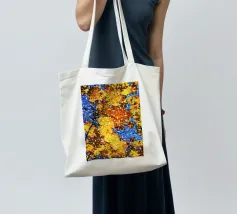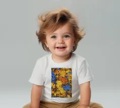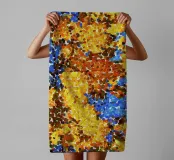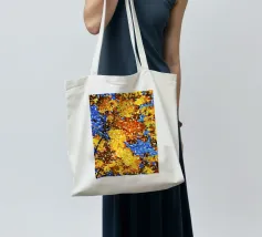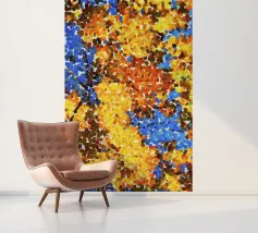 An abstract transformation of autumn leaves against a blue sky, rendered in pointillist style with colorful dots, circles, and hexagons. The playful composition captures the essence of fall in a modern, artistic way, perfect as wall art for living rooms, offices, or creative spaces.
