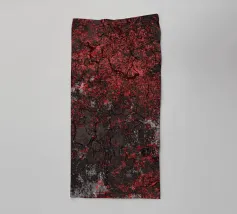 Bold black and red paint splashes cover a dark surface, creating an abstract design. The contrasting colors emphasize texture and depth, enhancing artistic expression.