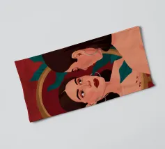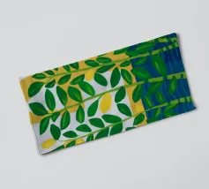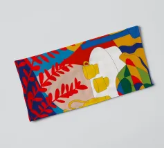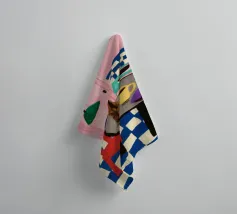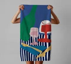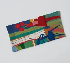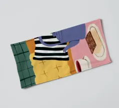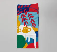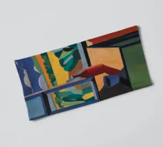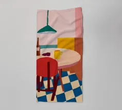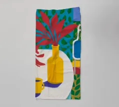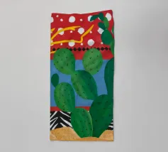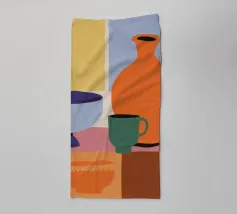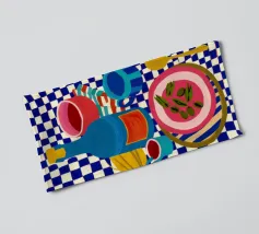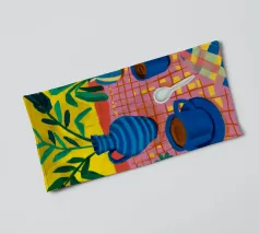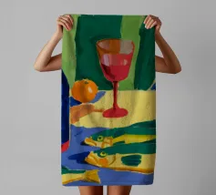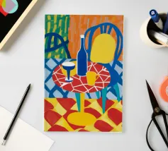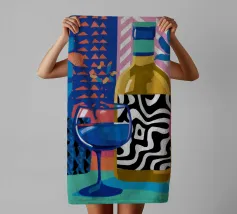 A highly stylized and abstract still life featuring a beverage in a wicker wrapped glass with a blue straw. The scene is set on a surface with bold red and yellow patterns, against a textured green background.