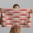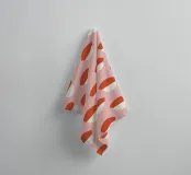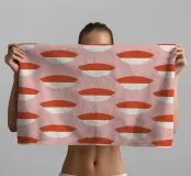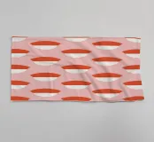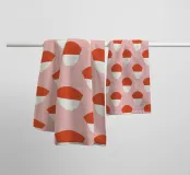 A repeating pattern features red and white geometric shapes on a soft pink background. Each shape resembles a half-circle stacked on a trapezoid, creating a cohesive and rhythmic design.