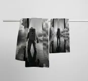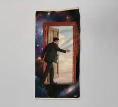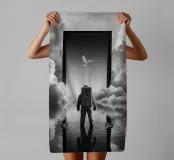 This striking black-and-white artwork features an astronaut standing in calm, reflective water as a towering portal opens before them. Soft clouds surround the scene, creating a dreamlike atmosphere, while a white dove ascends through the doorway, symbolizing hope, peace, and transcendence. The contrast of futuristic imagery with serene, spiritual elements evokes mystery and introspection. Perfect for lovers of surreal art, sci-fi themes, and minimalist monochrome design, this piece adds depth, emotion, and modern elegance to any space.