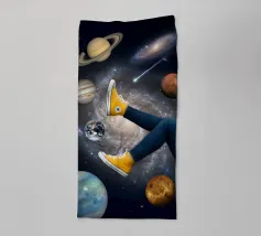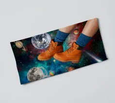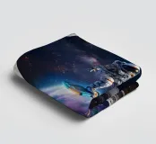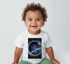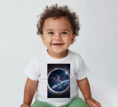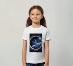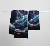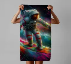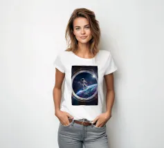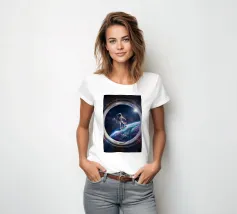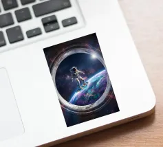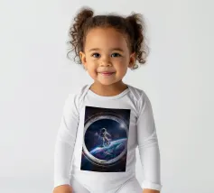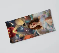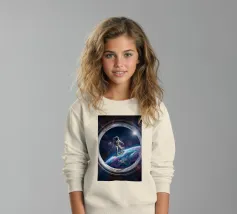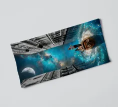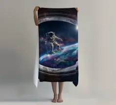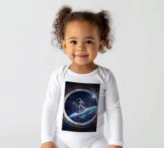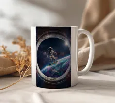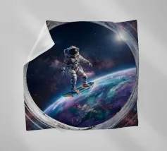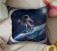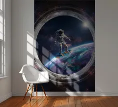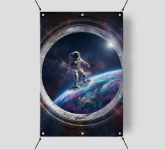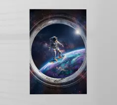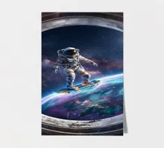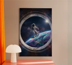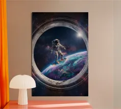 This futuristic sci-fi artwork features an astronaut gliding on a glowing hoverboard high above Earth, framed by a circular spacecraft window and surrounded by countless stars. Vivid cosmic colors, neon lighting, and playful imagination blend into an adventurous space fantasy that feels bold and full of motion. Perfect for collectors of sci-fi art, gaming rooms, and modern interiors seeking a vibrant space theme. A unique wall print for dreamers, explorers, and anyone inspired by futuristic technology and outer-space imagination.