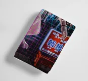 The image features an astronaut in a white spacesuit, seemingly walking through a neon-lit Tokyo street. The astronaut's helmet reflects the surrounding lights. A bright, circular light source is positioned behind the astronaut. A blue and pink retro grid overlay adds a futuristic, cyberpunk aesthetic to the scene.