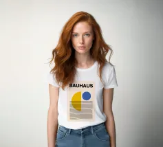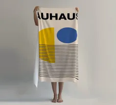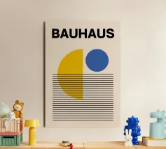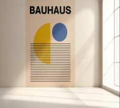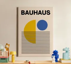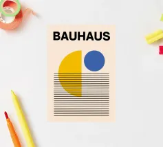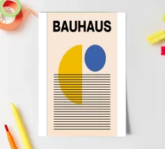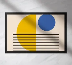 Immerse yourself in the purity of form with this striking Bauhaus-inspired abstract art print. The design features a compelling composition of a bold yellow semicircle, a vibrant blue circle, and a minimalist rectangular block of horizontal black lines. This piece elegantly embodies the core principles of the Bauhaus movement, emphasizing geometric abstraction, balance, and the interplay of primary colors. Produced at an impressive 7000x5000 pixels resolution and 300 dpi, this high-quality digital art ensures every crisp line and vibrant hue is rendered with exceptional precision, making it a