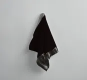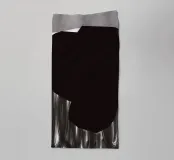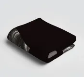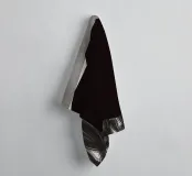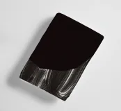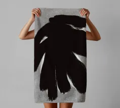 A bold, black geometric shape dominates the center, contrasting with sweeping, curved lines below it. The monochromatic composition creates a dramatic visual impact.