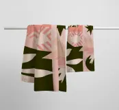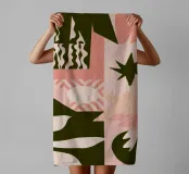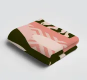 A modern, abstract composition featuring a patchwork of various patterns and shapes. Elements include organic leaf like forms, geometric grids, and abstract textures in a muted palette of pink, black, and beige, reflecting a bohemian, eclectic style.