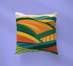 A vibrant landscape of bountiful, rolling fields of crops under a sunny sky with fluffy clouds. The stylized, colorful depiction of the countryside celebrates the beauty and abundance of agricultural land.