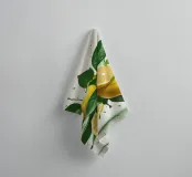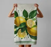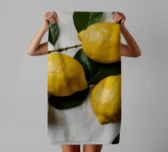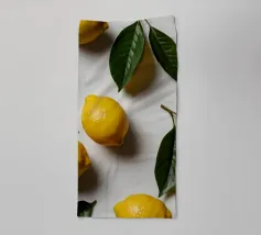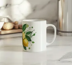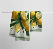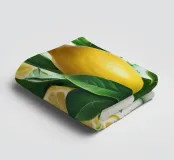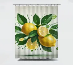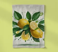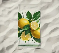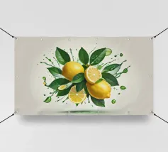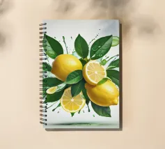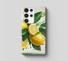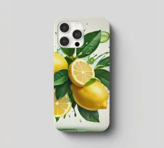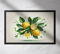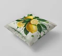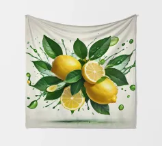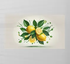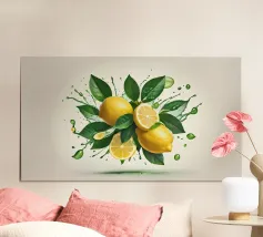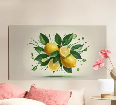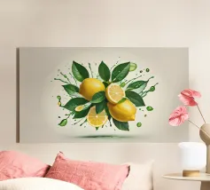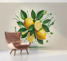 Fresh lemon halves are bursting with juice, creating a dynamic splash against a light backdrop, enhanced by vivid green leaves that add a pop of color.