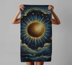 A golden orb emerges from swirling deep blues, like a cosmic seed of creation. Powerful and mysterious.