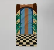 A view through a beautiful archway, with a black and white checkered path leading the eye through a lush, tropical garden. The composition is serene, elegant, and has a timeless, architectural beauty.
