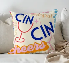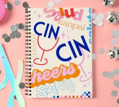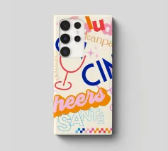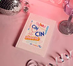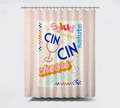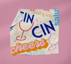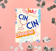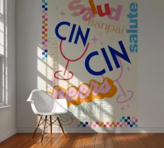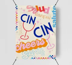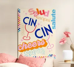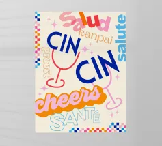 Raise a glass with this joyful and retro-inspired artwork celebrating global toasts! Featuring the word “Cheers” in a mix of vibrant languages Cin Cin, Kanpai, Salute, Proost, Salud this colourful design is set in a bold palette of bright blue, red, pink, and orange on a soft ivory background. Decorative details like stars, colourful checkered borders, and two minimalist wine glasses in keyline style add a playful vintage twist. Perfect for kitchens, bars, cocktail corners, or even recipe books and tea towels, this piece brings good vibes, good company, and a splash for good times!