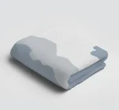 A minimalist depiction shows abstract mountain peaks with mirrored reflections against a soft blue background. The simplistic style emphasizes the jagged edges and serene atmosphere.