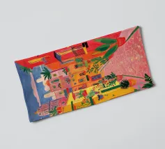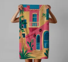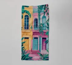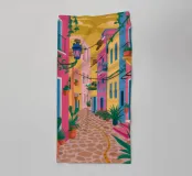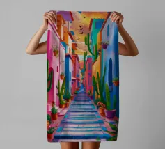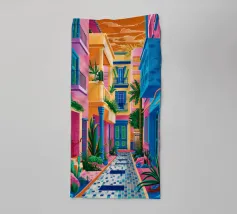 A vibrant illustration of a narrow cobblestone alleyway in a European town, flanked by brightly colored buildings and lush greenery, full of life and charm.