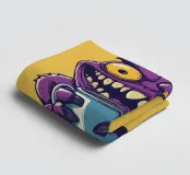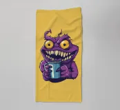 A whimsical purple monster with sharp teeth, bright yellow eyes, and a mischievous grin clutching a blue coffee mug. The playful cartoon style adds a fun, quirky vibe perfect for humorous or caffeine-themed projects.