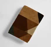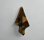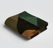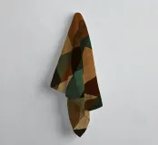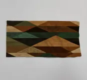 This artwork features an intricate arrangement of triangles in varying shades of brown, green, and cream, creating a visually striking and textured pattern.