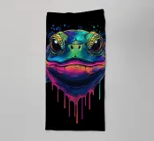 An intense portrait of a turtle that catches the eye with strong neon colours. The close-up of the animal's face captivates with bright shades of blue, green and pink, which flow into an artistic colour gradient. Splashes of colour and flowing drops of paint reinforce the street art character of the image. The focus is on the large eyes and the detailed scales, which give the motif an almost vivid depth. The black background area ensures maximum colour impact and powerfully emphasises the composition.