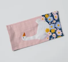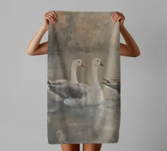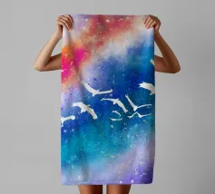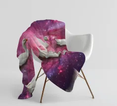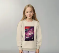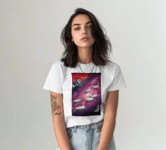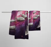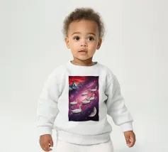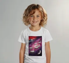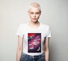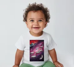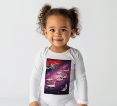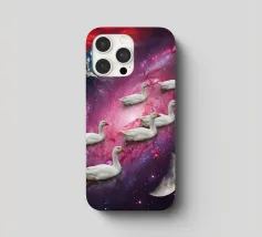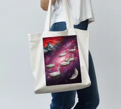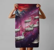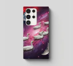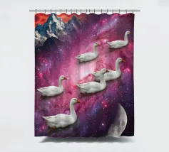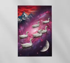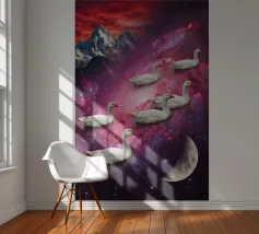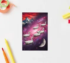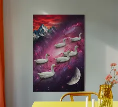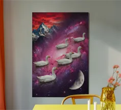 This whimsical artwork blends surreal fantasy with cosmic wonder, featuring a group of white ducks peacefully floating across a vibrant pink and purple galaxy. Snow-capped mountains rise beneath a fiery red sky, while a glowing crescent moon adds a magical celestial touch. The playful contrast between serene ducks and the vast universe creates a bold, imaginative design perfect for quirky interiors, dreamers, and lovers of surreal, galaxy-themed art. A fun and unique statement piece for any modern space.