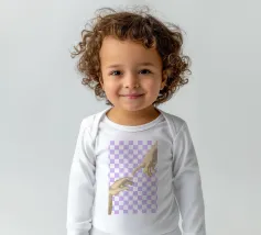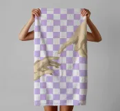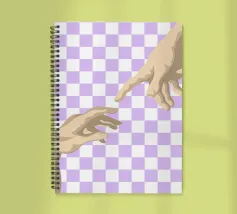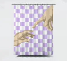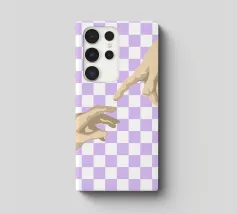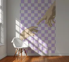 Bring a touch of classical art with a modern twist to your walls with this minimalist graphic print, inspired by Michelangelo's iconic 'The Creation of Adam'. The artwork features the famous reaching hands rendered in a clean, flat style against a stylish purple and white checkerboard background. Produced as a high-quality digital art print with an impressive 7000x5000 pixel resolution at 300 dpi, it ensures exceptional detail and brilliant color fidelity, suitable for printing in various sizes. A perfect piece for minimalist interiors, art history enthusiasts, or anyone who loves unique aesth