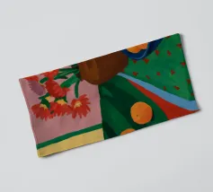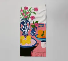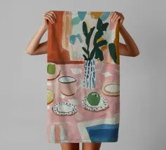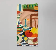 An abstract, cubist inspired interior scene of a table with a lamp, vase, and bowls. The fractured forms, geometric shapes, and muted color palette create an intellectual and artistic interpretation of a simple domestic space.