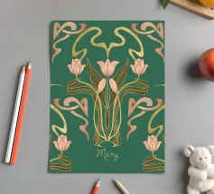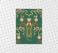 Add a touch of timeless elegance with Deco Tulip Bloom, a customizable Art Deco floral print in rich deep-forest tones. Inspired by vintage Nouveau motifs, this artwork combines refined tulip shapes with geometric symmetry for a luxurious statement piece. Personalize it with your name or a loved one’s to create a unique gift or a bespoke accent for your home. Perfect for Art Deco, floral, or modern classic interiors.