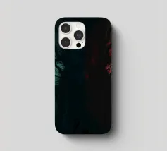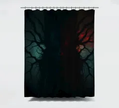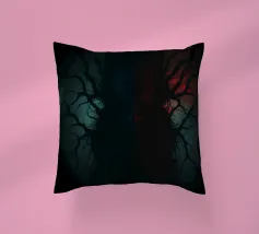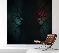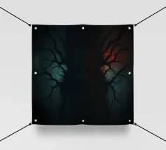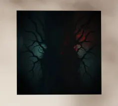 A gnarled tree stands at the center, its twisted branches reaching outwards. Red and blue lights cast haunting shadows in a dimly lit, abandoned area, creating an unsettling atmosphere.