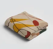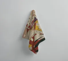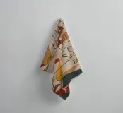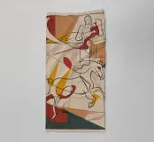 This artwork depicts dynamic figures in motion, using a combination of red, yellow, and beige tones. The lines and shapes suggest movement and energy.