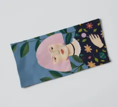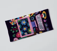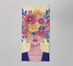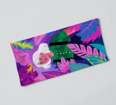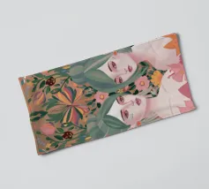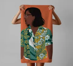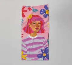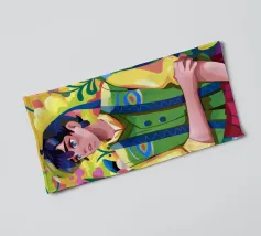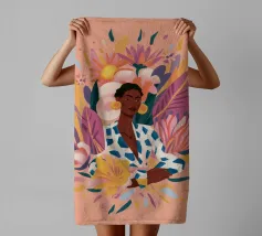 This artwork depicts a person in a vibrant yellow floral top and blue pants, striking a dynamic pose against a pink background with orange floral patterns.