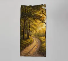Step into a world of vibrant color and serene light with this captivating piece. This painting depicts a magical forest path winding its way towards a brilliant, glowing clearing. Towering, ancient trees with deep blue and green foliage create a natural archway, guiding the viewer's eye. The sun-dappled trail is lined with patches of delicate wildflowers, adding splashes of pink and purple to the lush, green undergrowth. The ethereal glow at the end of the path draws you deeper into this enchanted scene, promising a sense of hope, wonder, and tranquility. This artwork is perfect for adding a t
