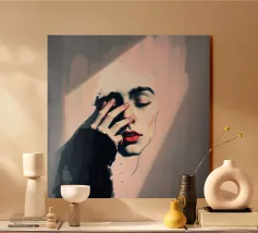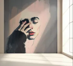 This artwork portrays a person expressing deep emotion, partially obscured by a hand. The light striking their face adds intensity to the expression and atmosphere.