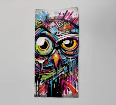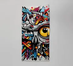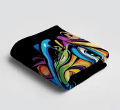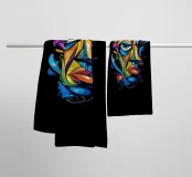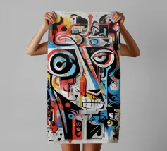 A dynamic abstract cubist portrait showcasing vibrant colors, surreal facial features, and bold brushstrokes against a stark black background. The composition exudes creativity, energy, and contemporary artistic style.