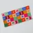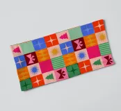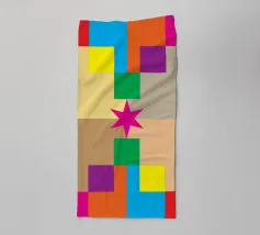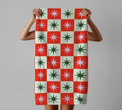 A joyful chequered pattern in bold and bright colours with blue, burgundy red, orange, pink, peachy, green - with simple minimal Christmas icons with tree, stars, sun, bows, stripes This minimal joyful composition celebrates the season through geometric harmony and playful colour. A perfect piece to bring festive cheer to your wall, accessories, towels, and more — part of a Christmas collection