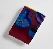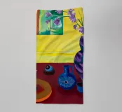 A vibrant still life displays a collection of colorful vases (purple, blue, striped), bowls, and decorative objects artfully arranged on a bright yellow tabletop against a pink and green segmented wall.