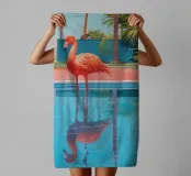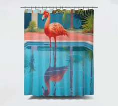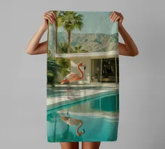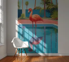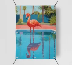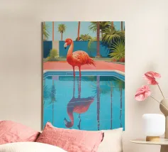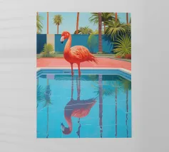 This dreamlike pool scene epitomises Californian mid-century glamour to perfection. The majestic flamingo in front of the geometric pool landscape is reminiscent of David Hockney's iconic swimming pool paintings of the 1970s. The bright coral tones against the turquoise pool water create a hypnotic harmony of colour, while palm trees exude pure Palm Springs nostalgia. The hyper-realistic style with subtle retro influences makes this poster the perfect statement for all lovers of vintage luxury and tropical flair!