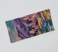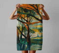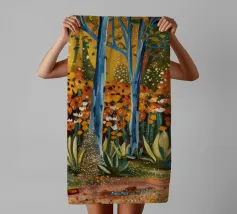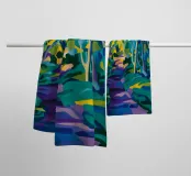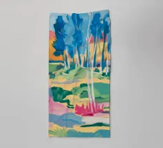 An expressive, painterly landscape of a path alongside a stream flowing through a forest. The vibrant blues, greens, and yellows create a dynamic, beautiful, and slightly abstract depiction of a walk in nature.